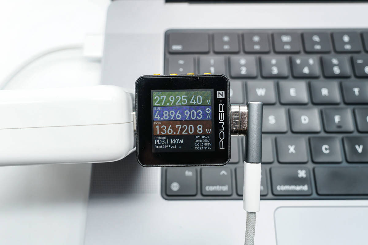 Даже... он также поддерживает быструю зарядку мощностью 140 Вт, а адаптер подключается к зарядному устройству Apple на нитриде галлия мощностью 140 Вт и кабелю быстрой зарядки MagSafe 3. В это время напряжение зарядки составляет 28 В, а мощность — 135,72 Вт.