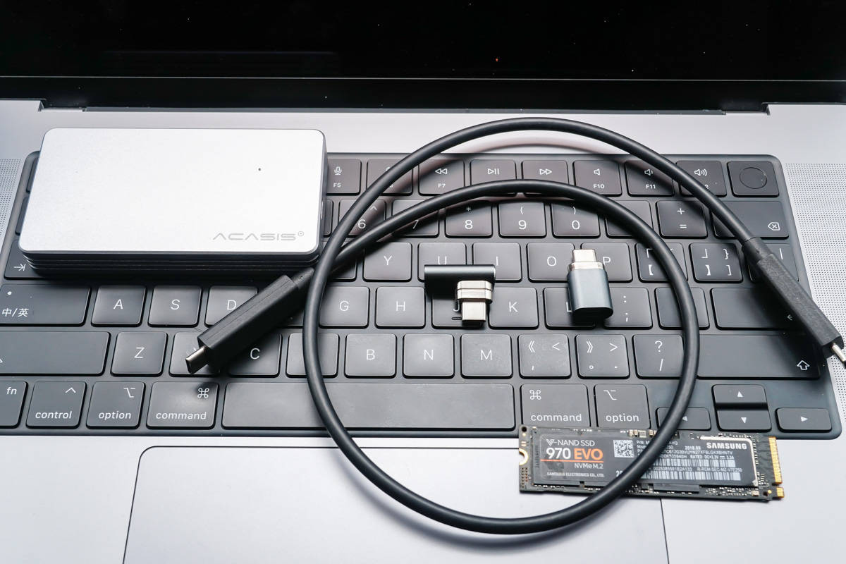 Далее давайте взглянем на тест передачи данных. Используемые инструменты: твердотельный накопитель Samsung 970 EVO, жесткий диск Thunderbolt 3, кабель для передачи данных Thunderbolt 3 и два адаптера.