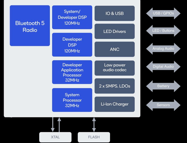 Система-на-кристалле (SoC) Qualcomm QCC5124 предназначена для удовлетворения потребностей небольших устройств в надежном, высококачественном беспроводном прослушивании через Bluetooth с низким энергопотреблением для более длительного воспроизведения звука. Архитектура QCC5124 предназначена для обеспечения высокой производительности при низком энергопотреблении. По сравнению с предыдущей технологией энергопотребление может быть снижено на 65 процентов, что обеспечивает более продолжительное воспроизведение звука практически во всех режимах работы.